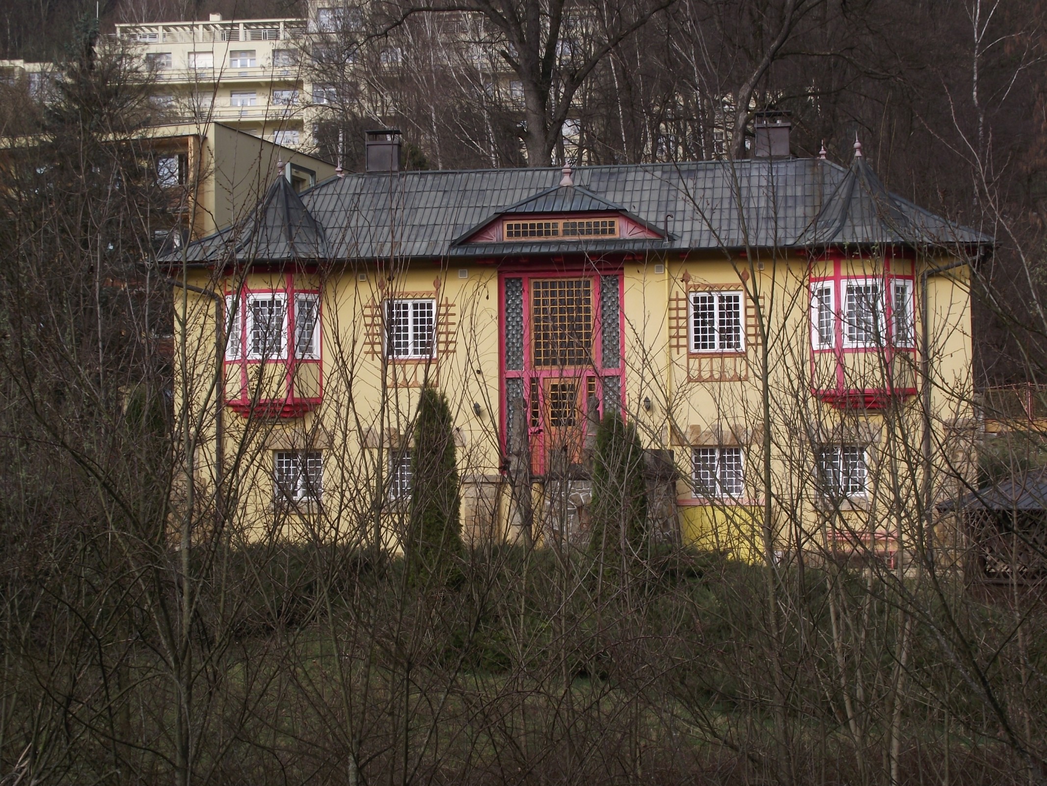 Vilka je sice půvabnou, ale současně relativně velmi nenápadnou stavbou, zejména proto, že hlavní pozornost poutá její vyzývavá sousedka (však to známe, že chlapi…). Tou je další Jurkovičova stavba, pro tohoto stavitele atypická vila Valaška. Cihlovou a v patře hrázděnou vilku Vlastimilu koncipoval slavný slovenský architekt v duchu hnutí moderny a uplatnil zde kombinaci secesních motivů s naturalistickými prvky. Vstup do vily vede přes nekonvenčně řešenou terasu na prstenových pilířích. Nad vchodem zvýšil působivost fasády vysokým schodištním oknem ze skleněných tvárnic a v patře doplnil rohovou dřevěnou verandou se štíhlými rovnými sloupy.