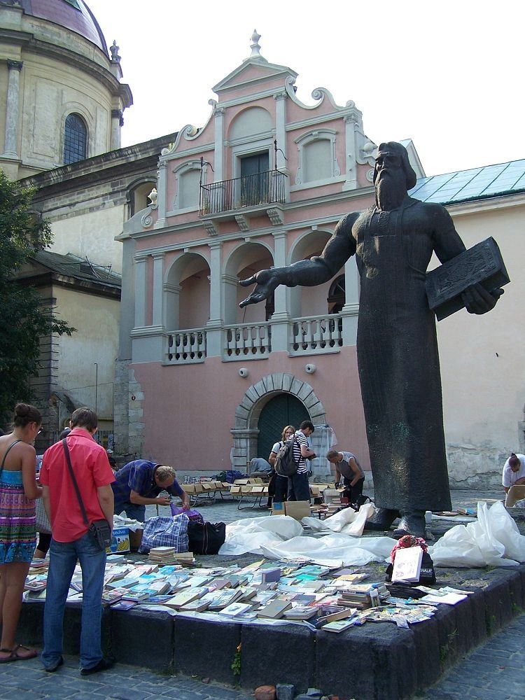 Ivan Fjodorov byl první knihtiskař ve Lvově a vůbec na celé Ukrajině. V jedné ruce drží svou první vytištěnou knihu Apostol, druhou rukou pak kyne těm, kteří se tu snaží prodat staré knihy rozložené na igelitech, dřevěných stolcích či drátěných vozících. Ocitli jste se na jakémsi antikvariátu pod širým nebem...