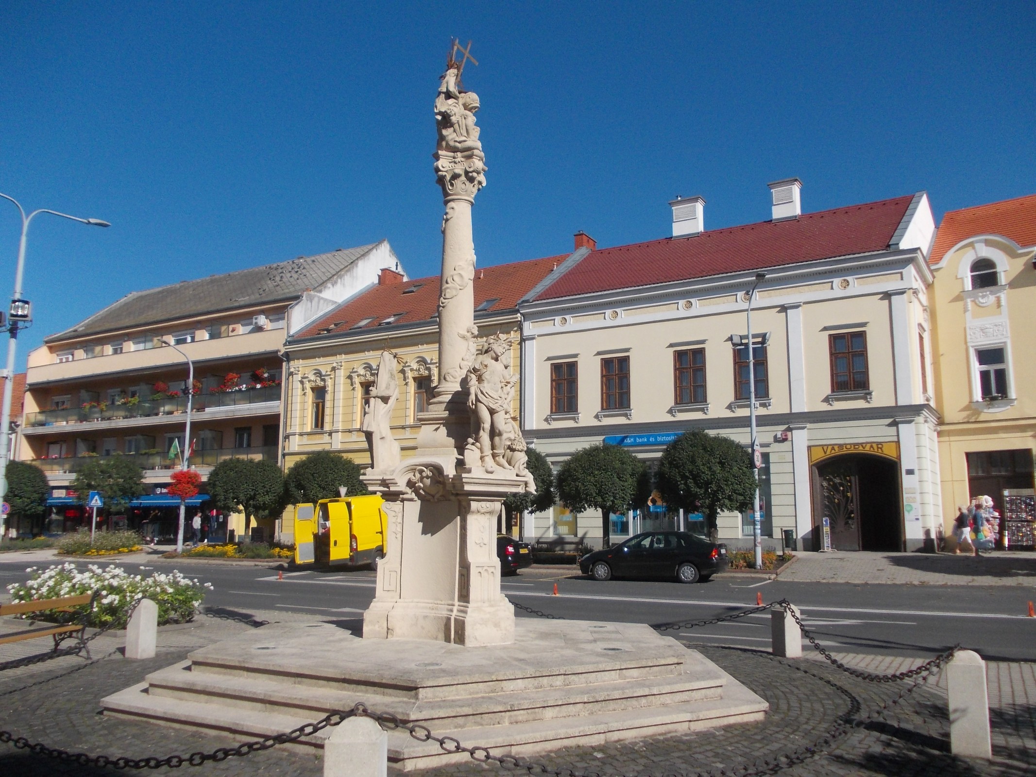 Hlavné námestie - Fö tér v meste Tapolca sa nachádza na ulici Deák Ferenc, v minulosti plnilo funkciu ako centrum obchodovania, konávali sa tu trhy a jarmoky. Uprostred námestia je jeho dominanta, je to stĺp sv. Trojice so súsoším, ktorý postavili v roku 1757 na podnet sudcu Padányiho. Stĺp a sochy, Szentháronság sú postavené v barokovom štýle a sú z vápenca. Podstavec stĺpa je postavený v tvare šesťukolníka o troh schodov. V hornej časti, na stĺpe sú otec, syn a duch svätý, pod nimi, v dolnej časti špiralovito zdobeného stĺpa je socha Panny Maria. Na podstavci, ako som sa dozvedel sú umiestnené tri sochy svätcov. je to socha sv. Kryštofa, mučetníka a jedného zo 14. svätých pomocníkov, patrona pútnikov, cestujúcich, vodičov, baníkov a leteckých záchranárov. Druhá socha je sv. Florián, svätec, mučetník, patron hasičov, pekárov, hrnčiarov, hutníkov a tiež komikov. Tretí je sv. Roch, francúzky katolícky svätec, uctievaný ako patron proti moru. Sochu sv. Floriána som poznal, ale sochou prestrieľanou šípmi by podľa mňa mal byť sv. Šebestián, rímsky vojak a kresťanský mučetník, patron vojakov, strelcov, hrnčiarov, takže neviem. Rekonštrukčné práce na tomto stĺpe so súsoším prebehli v rokoch 1863 a 1998.