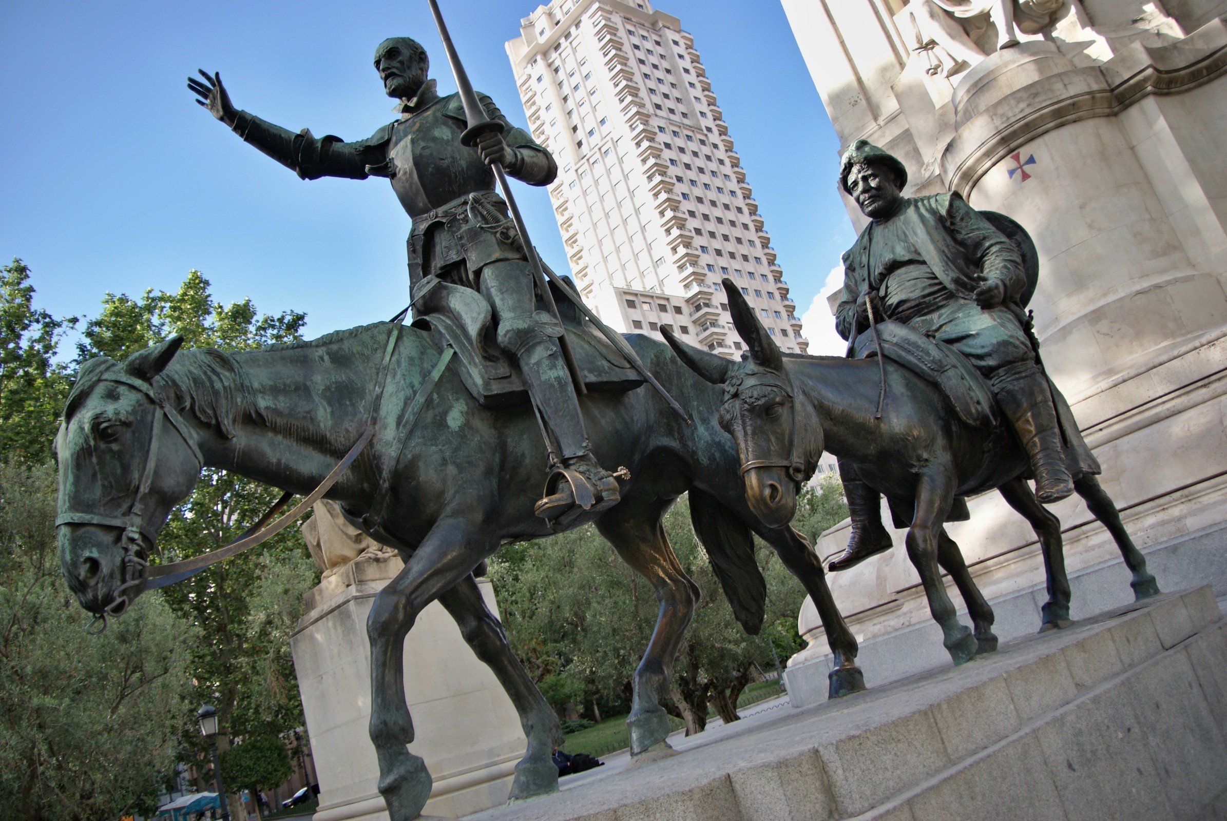 Jméno Miguel de Cervantes y Saavedra zná asi každý a jeho madridští mu zjevně rozumí. Proto tomuto spisovateli také v centru Španělského náměstí (Plaza de España) postavili monumentální památník, kolem kterého se nachází oblíbená zábavní a relaxační zóna s vodní plochou. Nejvíce zde ale jistě zaujmou sochy Dona Quijota na Rocinantě a Sancho Panzy na oslu, tedy zpodobnění hrdinové nejslavnějšího Cervantesova románu. A sám velký Miguel sedí právě nad postavami, které vytvořil. Nesmí chybět ani zpodobnění velkých lásek Dona Quijota, tedy vesničanky Aldonzy Lorenzo a urozené Dulciney z Tobosa. A zatímco hlavní část památníku byla vyrobena z žuly, sochy jsou bronzové.
