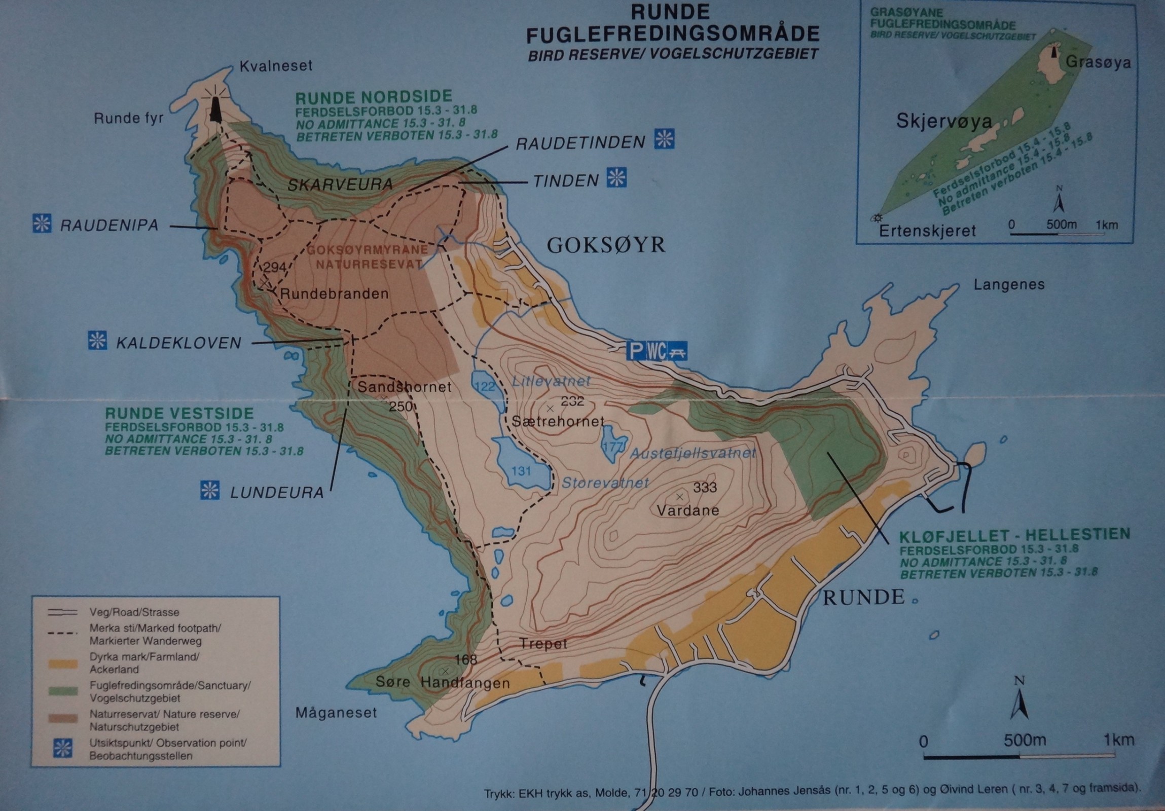 Ostrov Runde na Malých Lofotách je přímo kouzelný a nezapomenutelné jsou i zážitky. Nejdříve jsme z Alesundu jeli trajektem a pak již autobusem přes most na ostrov. Ostrov je hojně navštěvován turisty, protože je známý jako hnízdiště ptáků na tamních skalních útesech. Vyskytuje se zde okolo 240 druhů mořských ptáků, mezi nimi papuchálek (nazývaný mořský papoušek), terej, chaluha, racek tříprstý, orel mořský, alka, kormorán, pelikán, potáplice atd. V době hnízdění je prý na ostrově 500 - 700 tisíc ptáků, ale obyvatel zde žije jen 160. Na ostrově je výzkumná stanice a pracuje zde Ekologické centrum. Ostrov má i svou historii. V 18. stol. u jeho břehů ztroskotala holandská obchodní loď jedoucí do Batávie (Indonésie). Vrak lodě objevili v roce 1972 norští sportovní potápěči a našli zlatý poklad mincí. Část je uložena v muzeu v Bergenu a část v norském muzeu mincí a medailí v Oslu (Myntkabinettet).
