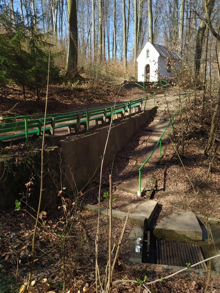 Léčivý pramen svaté vody, kaple a skalní jeskyně se sochou Panny Marie Lurdské poslední březnový den...
