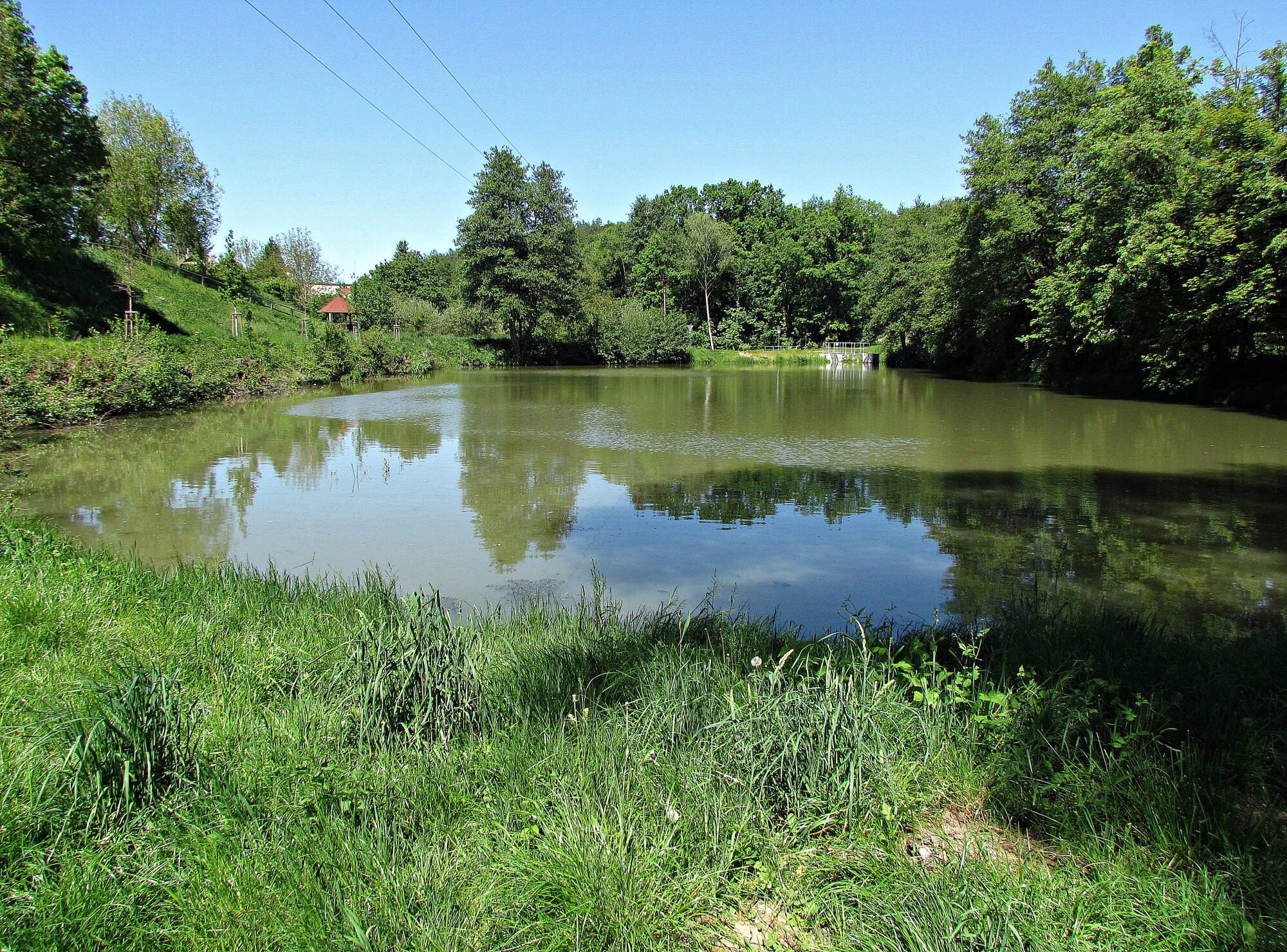 Při naší poslední návštěvě před šesti lety jsme nad hrází rybníka narazili jen na nový dřevěný odpočinkový altán, ale od té doby se jeho okolí notně změnilo. Úpravy vlastní vodní nádrže a okolí započaly roku 2022 a dokočeny byly před příchodem léta o rok později. Zarůstající území u zahrádkařských osad prošlo proměnou na hezky upravené přírodní prostředí vhodné k relaxaci. Západní stranu rybníka lemuje chodník s novými lavičkami, byl obnoven bývalý sad a vznikla zde Naučná stezka, jejíž pěšina prochází mezi dřevěnými plastikami. Já tedy viděl jen jednu na temeni travnatého svahu u sadů přímo nad rybníkem, ale kyprá skulptura ženštiny z drva pyšnící se dlouhým copem, se mi celkem líbila.