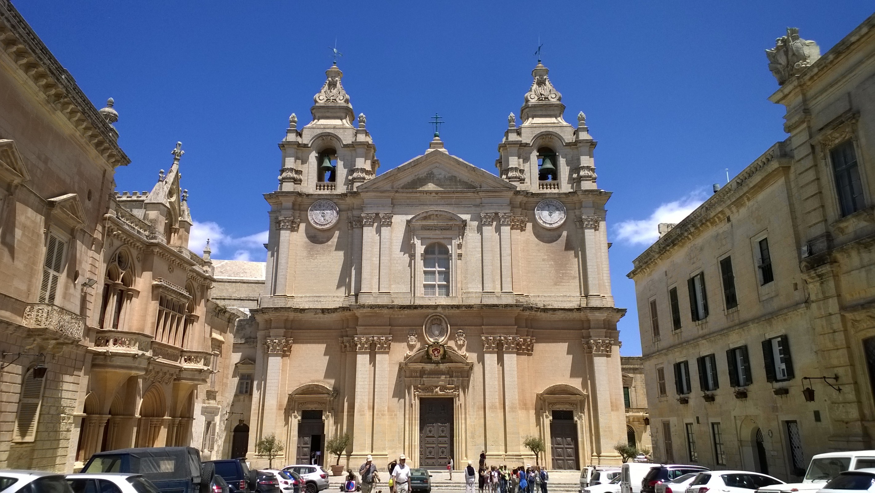 Pohled z útesů přes Golden Bay k ostrovu Gozo.