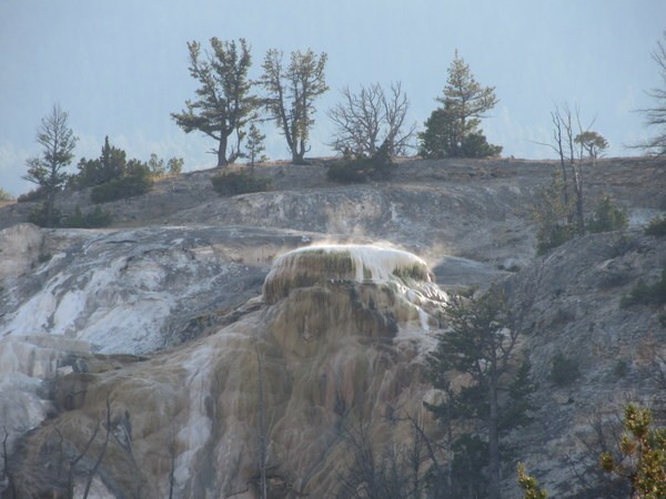 Což jsou úžasné útvary tvořené v oblastech kudy protéká vřelá voda ve strmějším prostředí. Terasy vytváří termofilní organismy, takže pokud změní potůček směr, staré terasy zemřou a jsou poněkud méně zajímavé. Nicméně tam byly tři "živé" terasy plné barev od sněhové bílé až po rudou. Pokud přijíždíte zdola od Gardineru tak hned za odbočkou (směr Yellowstone Canyon - silnice 212) je parkoviště odkud můžete prohlédnout dolní terasy. Pokud pojedete dál nahoru po silnici č. 89 tak zhruba po 1.5 km je doprava odbočka na okružní silničku skrze terasy se zastávkami u jednotlivých útvarů.