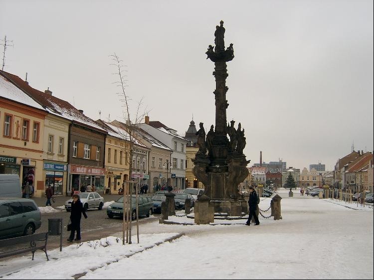 Mariánský sloup stojí volně v prostoru Husova náměstí, které tvoří střed historické části města Rakovníka. Tato vrcholně barokní skulptura je z roku 1749 a je tvořena středním pilířem, který je završen sousoším Panny Marie a čtyřmi úhlopříčně situovanými konzolami se sochami sv. Václava, Víta, Prokopa a Vojtěcha. Západní průčelí spodní části sousoší je zdobeno plastikou městského znaku. Na sloupu jsou tři plochy s latinsky psanými nápisy: URBS RACONA ATQVE BENEFACTORES PII HONORI MARIANO DEVOTE{I} EXSTRUXERUNT = Město Rakovník a dobrodinci zbožní úctě mariánské oddaně vystavěli; VIRGO DEI GENITRIX PIA PAX SIT IN URBE RAKONA QUAE BENEFACTORES PROVOCET IN MERITA = Panno Bohorodičko zbožná, pokoj ať je ve městě Rakovníku, aby dobrodince povzbudil k zásluhám; URBS RAKONA ET DEVOTI CULTORES MARIOPHILI EXSTRUXERUNT = Město Rakovník a oddaní ctitelé Marii milující vystavěli.