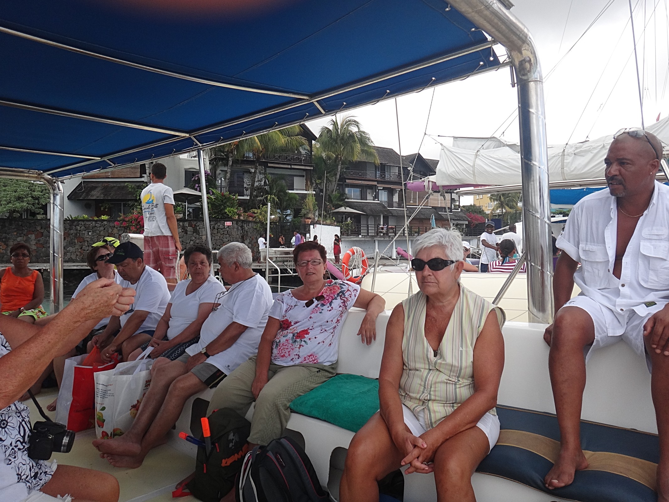 Následující den ráno po snídani, nasedáme v 8 hod. na autobus, cesta trvá asi 10 minut. Protože v Gran Baie máme ještě čas, zajdeme se podívat do několika místních butiků. V 8.30 jsme na stanovišti, já si ještě půjčuji, bezplatně jen proti podpisu,vybavení na šnorchlování. To se již schází celá skupina asi 30 lidí a krátce po 9 hod. vyplouváme k ostrovu Gabriel. Posádka zvedá plachtu, cestou z dáli vidíme naši pláž a míjíme ostrov Coin de Mire. Cesta potrvá asi 1,5 hod a my hned začínáme pitím rum-cola. Ale nemyslete si, jako pikniky v Karibiku to není, tam to teklo proudem. Pozorujeme moře, sluníme se a navazujeme hovor se skupinou také starších Francouzů a dalšími cestujícími.