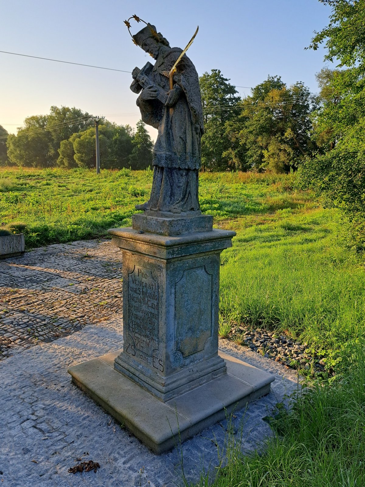 Sochu zmíněného světce jsem tentokrát objevil u mostu přes řeku Mži v Městě Touškově. Podle chronogramu by měla být zhotovena v roce 1765, ale její autor není znám. Možná i proto, že se několikrát stěhovala. Nejprve stála před domem čp. 55 na bývalém tržišti, později u mostu při staré silnici do Kozolup a Bděněvsi nad mlýnem čp. 66, v roce 1963 byla přemístěna k mostu přes řeku Mži. Na stávajícím místě se nachází až od roku 2021.