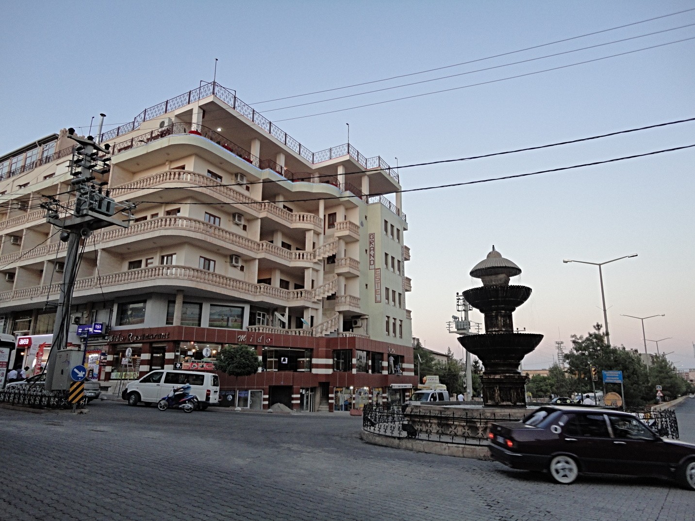 Čtvrtou noc svého pobytu v Turecku spíme v hotelu Grand Estel ve městě Midyat se spoustou památek. Hotel je hezký nejen zvenčí, ale i jeho vybavení je na dobré úrovni. S kufry nám opět pomáhá hotelová obsluha a po vyzvednutí klíčů jdeme na pokoj. Pokoj je standartně zařízen, s oddělenou postelí, když nejste rodina, stolkem a křesly, balkónem, hygienickým zařízením atd, jak je patrno z fotografie. Stojí na křižovatce hlavní ulice a shora je hezký výhled na město nebo křižovatku s fontánou. Byl přijemný teplý večer, tak jsme večeřeli na terase hotelu. V hotelové restauraci se připravují jídla turecké i mezinárodní kuchyně. Hotel má výtah, u kterého si můžete dokonce posedět a popovídat s přáteli. Další vybavení hotelu - parkování zdarma, recepce 24 hod., praní, žehlení, čištění bot, fax, kopírka, Wi-fi, fitnes, knihovna, trezor, denní tisk, obchod, topení pro zimní měsíce. Hotel je nekuřácký a není možnost přijít sem s domácími mazlíčky.