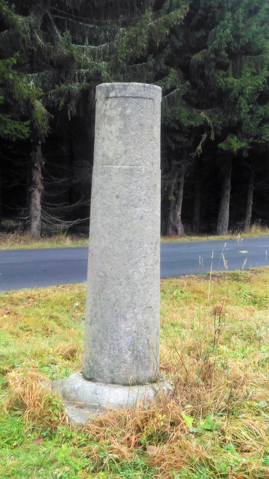 Historický kamenný milník ve tvaru sužujícího se válce stojí na křižovatce silnic a turistického rozcestí Pod Meluzínou.
