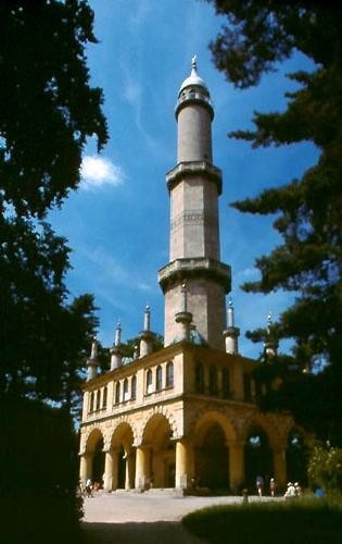 Romantický minaret též zvaný Turecká věž dal postavit kníže Alois Liechtenstein. Plány v maurském slohu zpracoval architekt Hardtmuth. Stavba probíhala v letech 1797 ? 1802. Jedná se o nejstarší dochovanou rozhlednu na českém území a zároveň o nejvyšší stavbu tohoto stylu v neislámské zemi. Protože se stavělo na močálovitém měkkém podloží, bylo nutno zajistit základy použitím roštů a pilotů z dubového dřeva. Celkovému vzhledu patrně dopomohli i umělci z arabských zemí.