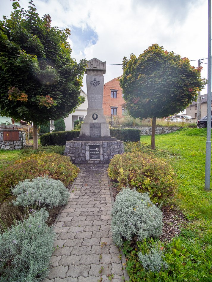 Ve spodní části je v půlkruhovém oblouku umístěn bronzový vavřínový věnec, v širokém základu obelisku pak deska z černého kamene se jmény 26 padlých a ztracených z 1. světové války, dole přidáno jméno Františka Dudy, který zahynul na konci 2. světové války s vročením 1938–1945.