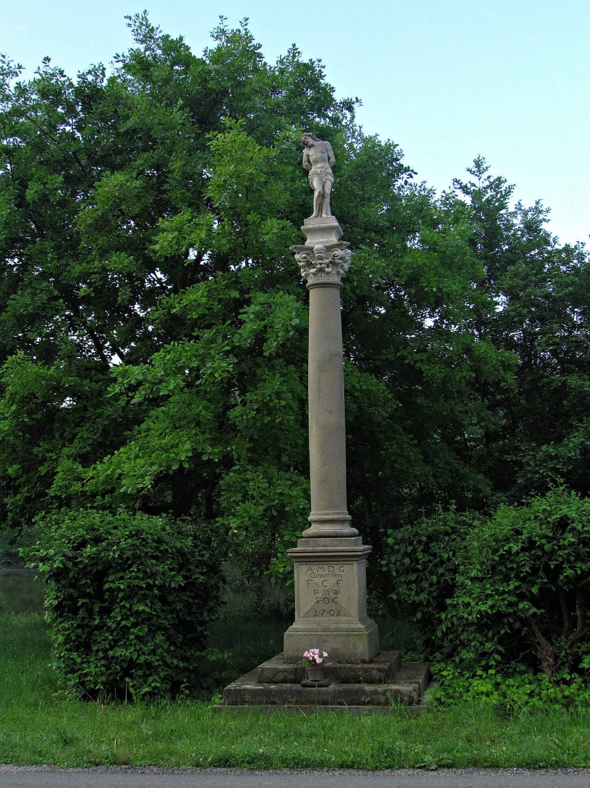 Stojí u silnice nad břehem Konventního rybníka poblíž křižovatky, z níž okolo areálu známého Archeoskanzenu Modrá odbočuje do obce vedlejší komunikace. Kamenné barokní dílo vysochané anonymním umělcem se skládá z originálního sloupu z 18.století a sochy Ježíše, která je dnes už jen kopií. Dvoustupňová hranolová základna nese čtyřboký sokl ukončený profilovanou římsou. Následuje sloup ukončený kompozitní hlavicí, na níž je umístěna tvarovaná podnož se skulpturou trpícího Krista. Ten je oděn pouze do bederní roušky, ruce má vzadu za tělem svázány a připoutány ke sloupu, hlavu výrazně nakloněnou k rameni. Původní originál i kopie byly zrobeny v podživotní velikosti.