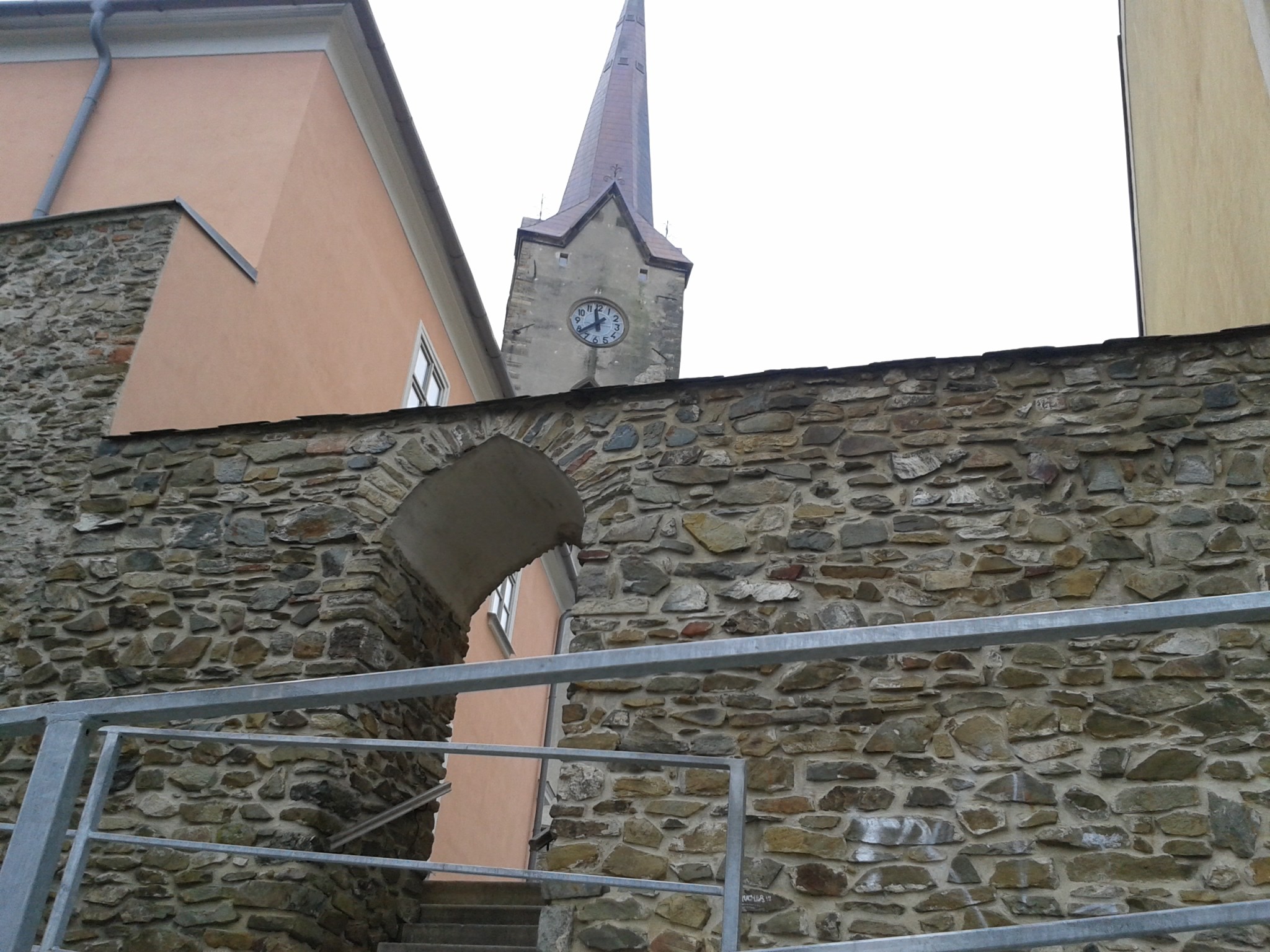 Krásná vstupní brána, která také zůstala zachována i se schody a městskými hradbami.