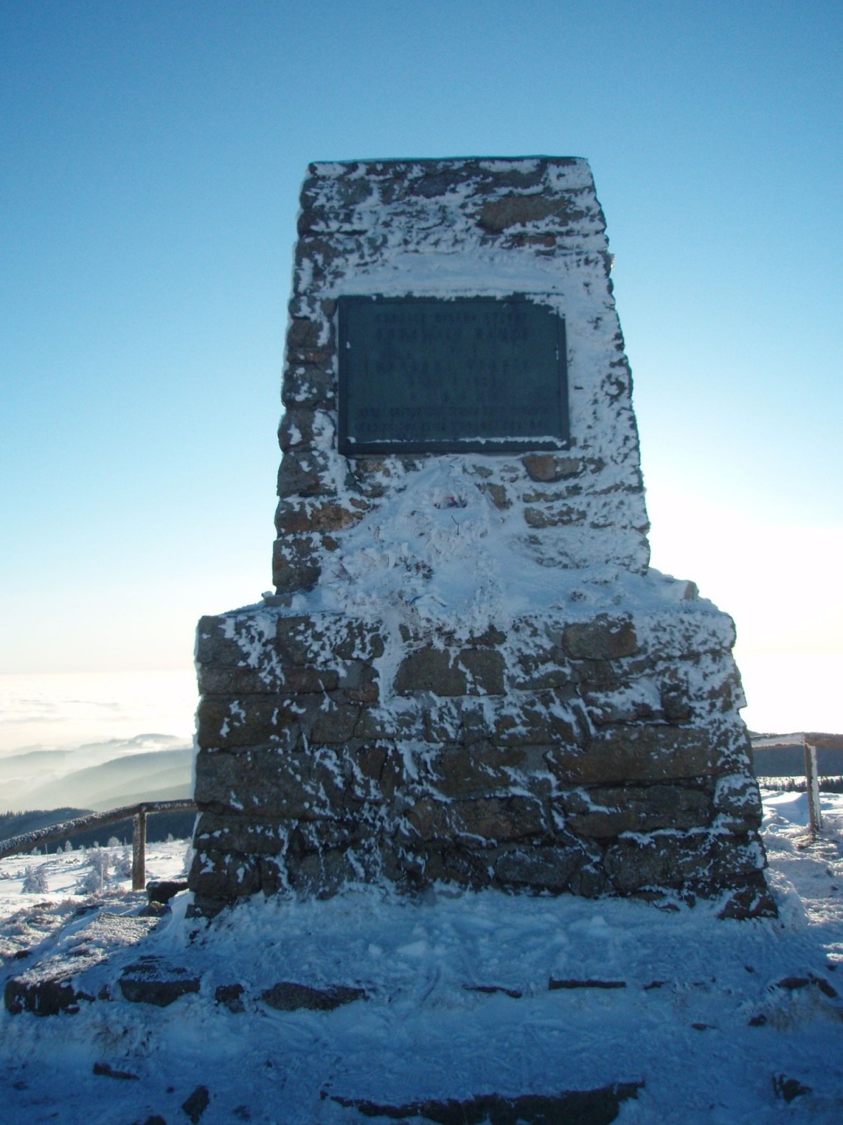 Já ji však míjím a podnikám poslední krátký výstup k cíli dnešního výletu. Je jím Mohyla Hanče a Vrbaty, která se nachází v nadmořské výšce 1.416 metrů na Vrbatově návrší na červené turistické značce mezi Vrbatovou boudou a Harrachovými kameny. V těchto místech byl v roce 1913 nalezen umrzlý Vrbata. Dnes je sice počasí obdobné jako onoho osudného dne, ale já to snad přežiji.