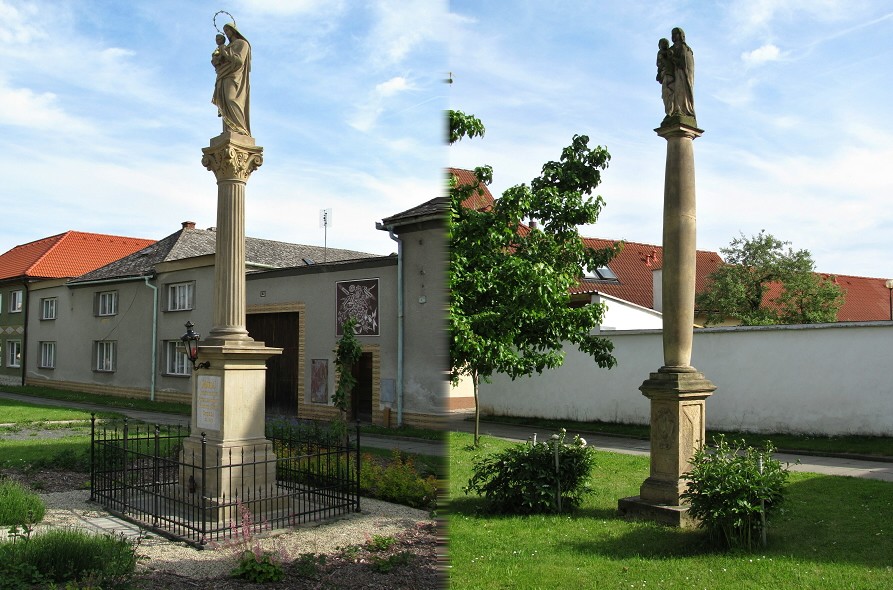 Starší z obou sloupů totiž pochází z roku 1703. V roce 1897 bylo rozhodnuto, že sloup bude pro špatný technický stav odstraněn a socha Panny Marie měla skončit v nice kartuziánské Kaple na místním hřbitově. Roku 1898 byl tedy vztyčen sloup nový … ale ten starý zůstal stát také. Zdejší zbožní občané totiž odmítli strhnout starý mariánský sloup, a proto zde i dnes stojí vedle sebe nerušeně oba dva.