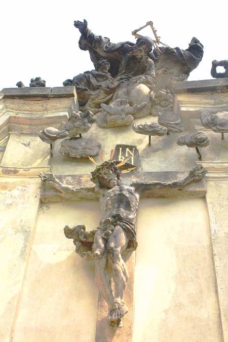 Jedná se o barokní zvlněnou stěnu, třemi krucifixy před ní, sochou Krista, žehnajícího Boha Otce nad ní a sochami Madony, Jana Evangelisty a dvou andělů po stranách. Tento jedinčný sochařský celek se připisuje J. Pacákovi a pochází z období kolem roku 1730. Tvoří dominantu zdejšího unikátního komplexu pozdně gotických, renesančních a barokních památek nacházejících se ve svahu Křížového vrchu.