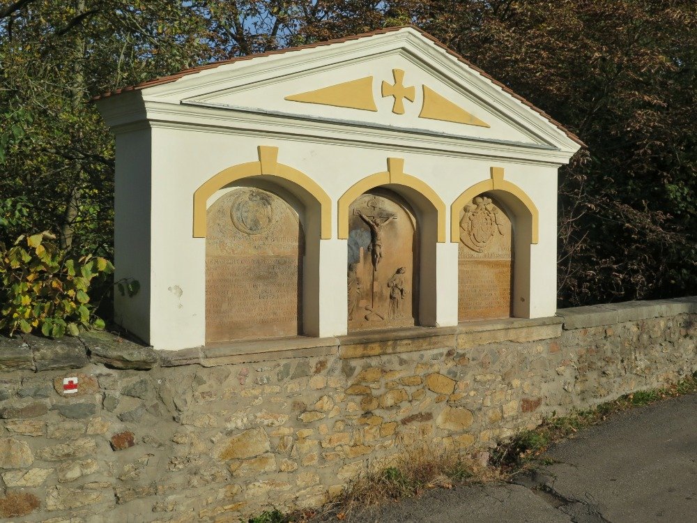 A co že tedy na jednotlivých pískovcových deskách můžeme vidět? Na té levé, která vlastně dala celé památce její „jméno“, liechtensteinský znak ve vavřínovém věnci a nápis, sdělující, že tuto desku pořídil roku 1665 Karel Eusebius z Lichtenštejna, a to na paměť povodně v roce 1663 a následné výstavby nové cesty. Středovou Kalvárii jsme již zmínili výše a na pravé desce si můžeme přečíst o rekonstrukci kamenného mostu v roce 1770.