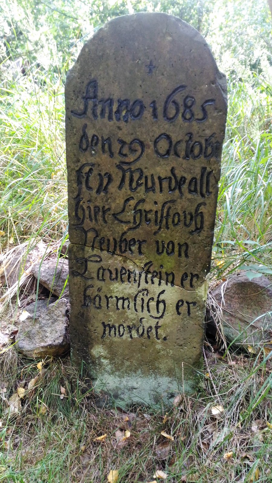 Pamětní kámen je 120 cm vysoký, byl přeražen a po opravě stojí na původním místě. Na kameni je nápis: Roku 1685, 29. října zde byl bídně zavražděn Kryštof Neuber z Lauensteinu.