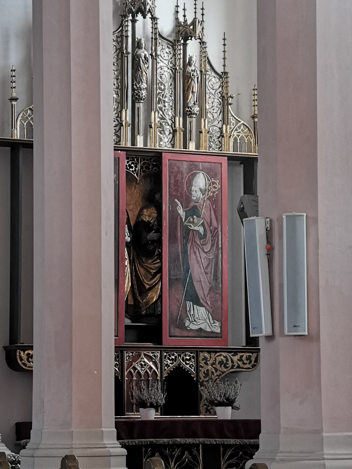 pohľad k jednému bočnému oltáru a kazateľnici, na stene obrazy krížovej cesty a