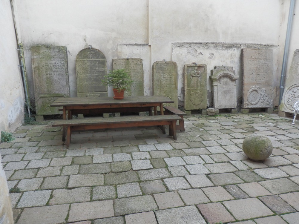 Na dvorku jsou k vidění náhrobní kameny a některé kamenné artefakty ze sbírek muzea. Část náhrobních kamenů je renesančních, část barokních, většina z nich však spadá do 19. století. Luštit nápisy vytesané v kameni návštěvník nemusí, jména, datum úmrtí, věk dožití a případně další informace jsou napsané u vstupu na dvorek.