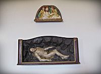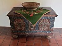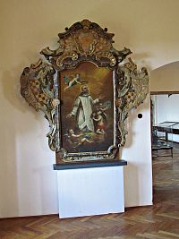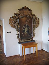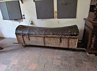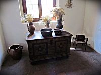 Zajímavým exponátem byl také na zemi umístěný nezvykle dlouhý koš s proutěným víkem, sloužící na odnos dočasných „mrtvol“ z městských hostinců.