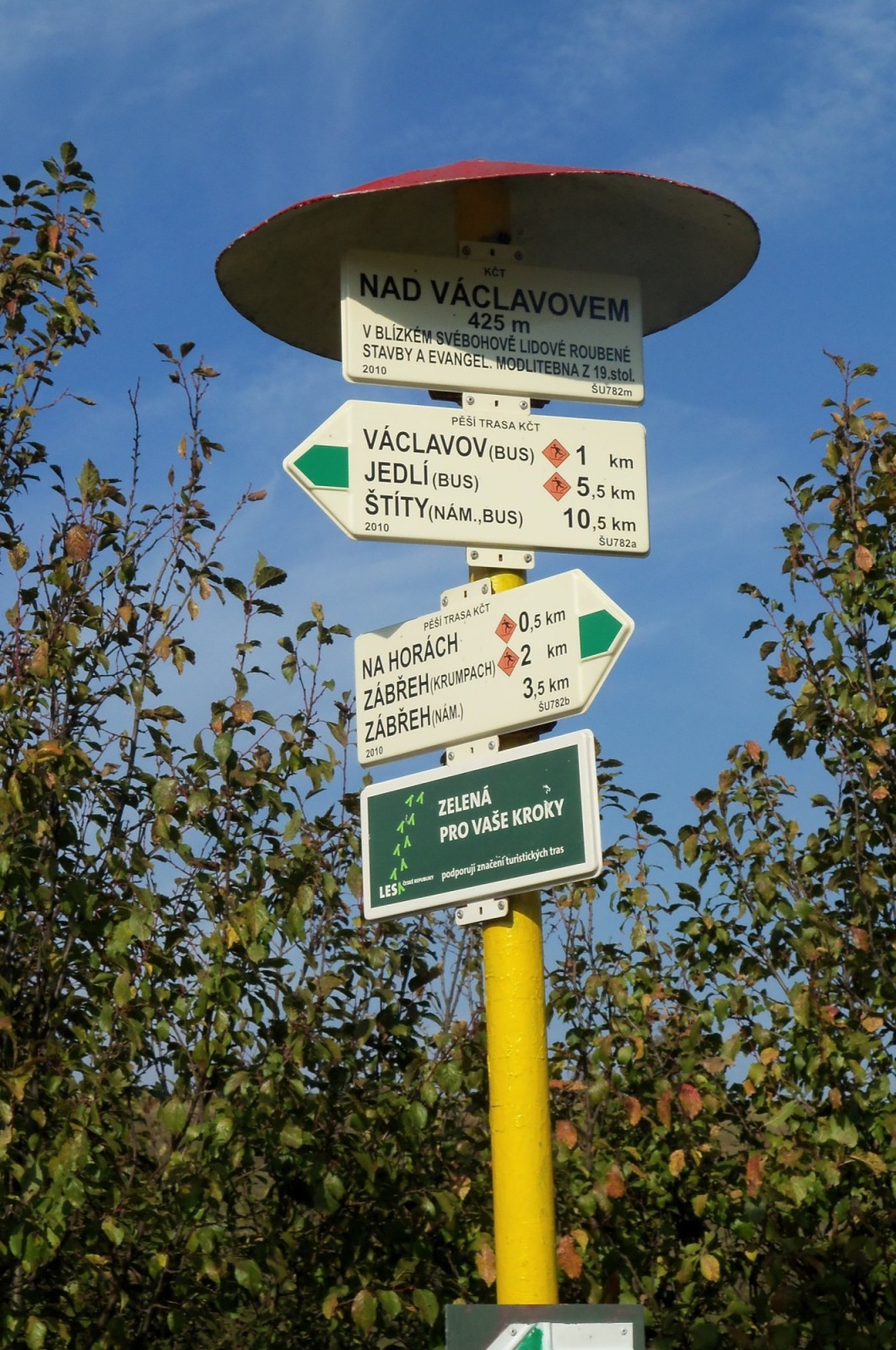 Rozcestí se nachází nad obcí Václavov pod kopcem Ovčáry uprostřed polí. Leží na zelené turistické trase. Více info na fotkách