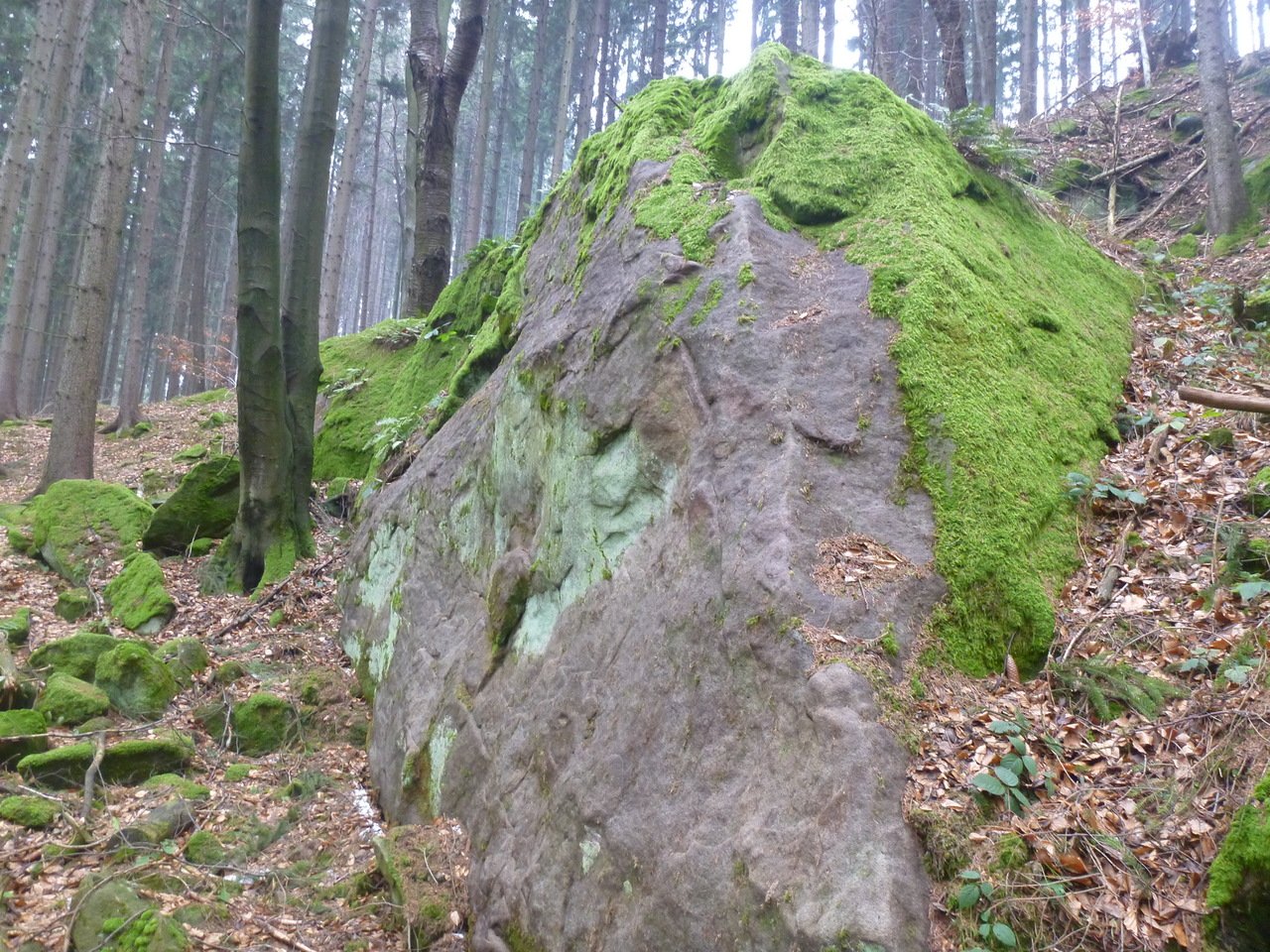 Zjišťuji, že jde spíš o „skalky“ menší (nižší) a ani se nejedná o žádné rozlehlé skupiny. Říká se, co je malé, to je milé a mě se určitě líbí. Zaručená oáza klidu a ani se člověku nechce moc odcházet. Když už jsem byl tady, tak jsem nemohl vynechat další známější místa a tak jsem přemýšlel jakým směrem k nim půjdu. Vracet se dolů a pak jít po mnohokrát prošlapané modré turistické trase se mi nechtělo a tak jsem se ani moc nebránil, když se přede mnou otevřela pohodová lesní cesta mířící přibližně severovýchodním směrem. Po nějaké době jsem uznal, že se stáčí příliš na sever a já se přece jenom potřebuji dostat k turistické trase. Nezbývá než zvolit sestup doprava svahem.