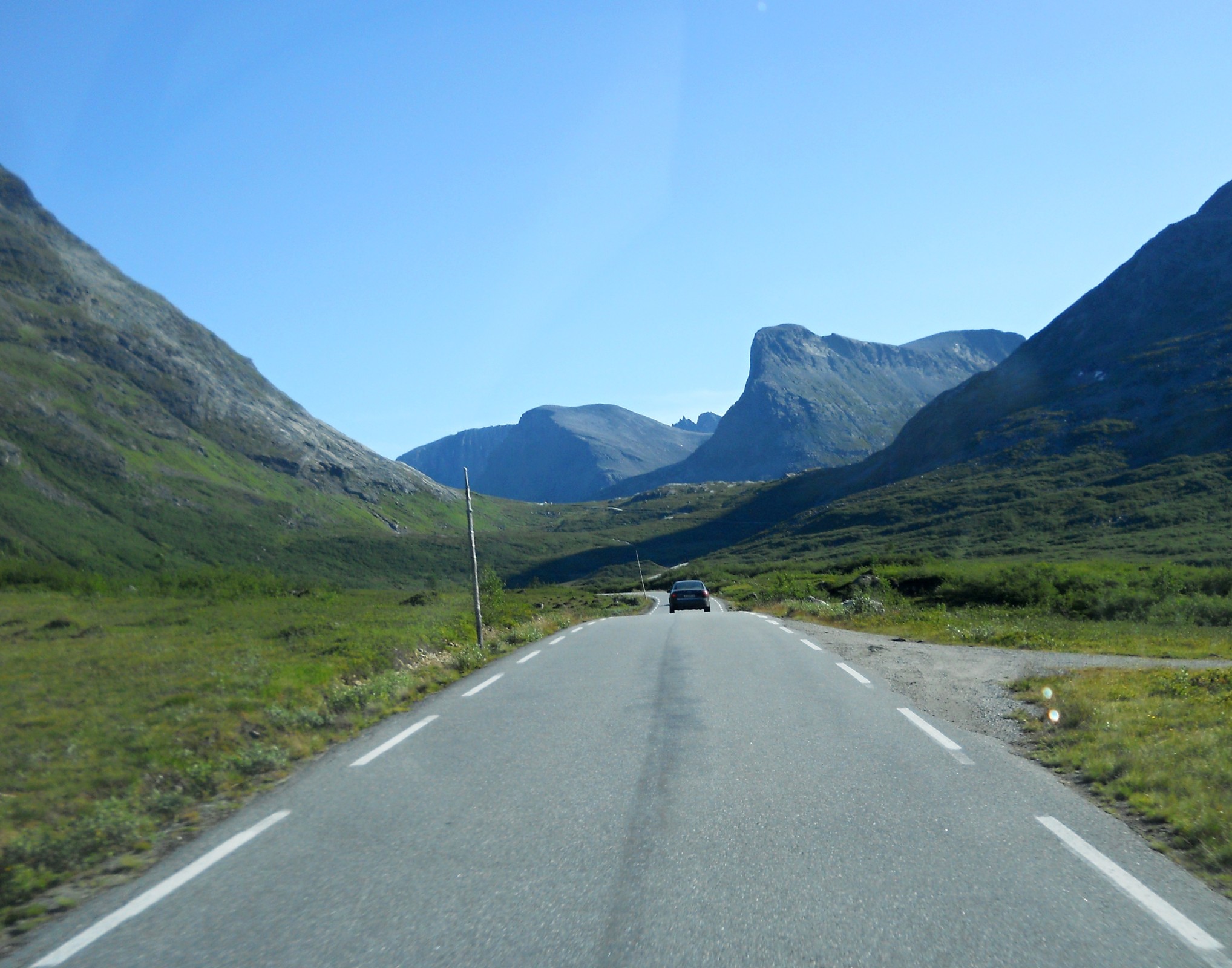 My jsme se při naší cestě Norskem zastavili v severnější části parku. Jak jsme prohlásili, tady určitě žijí Trolové. Celý horský masiv se jmenuje Trolltindan s vrcholy Trolltindan (1788 m), Trollryggen (1740 m), Trollklorn (1701 m), nejvyšší kolmá skalní stěna je Trollveggen (Trolí zeď), odjíždět budeme po Trolí stezce Trollstigen, kde je vodopád Trollfossen (185 m). Jen na parkovišti asi nebydlí – to je v sedle Stigrorbrua. Je zde nově vybudované zázemí, toalety zdarma, prodejny suvenýrů, kavárny. Vše je z betonu, ale je to pěkně zakomponované, ani to nevypadá rušivě.