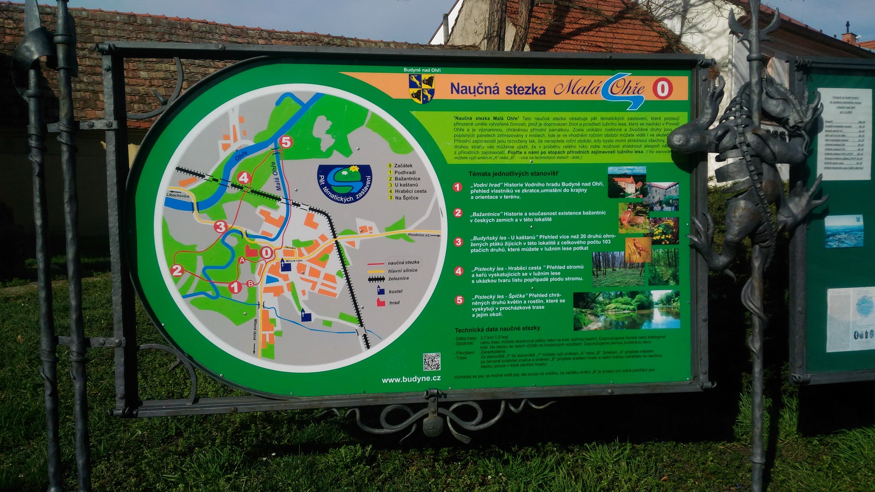 Malá Ohře je vlastně jen 6 km dlouhý náhon, který přiváděl vodu pro mlýn v Budyni. Naučná stezka je dlouhá 3 km a má šest zastavení s informačními tabulemi o unikátních rostlinných a živočišných druzích lužních lesů, o historii vodního hradu a města Budyně nad Ohří.