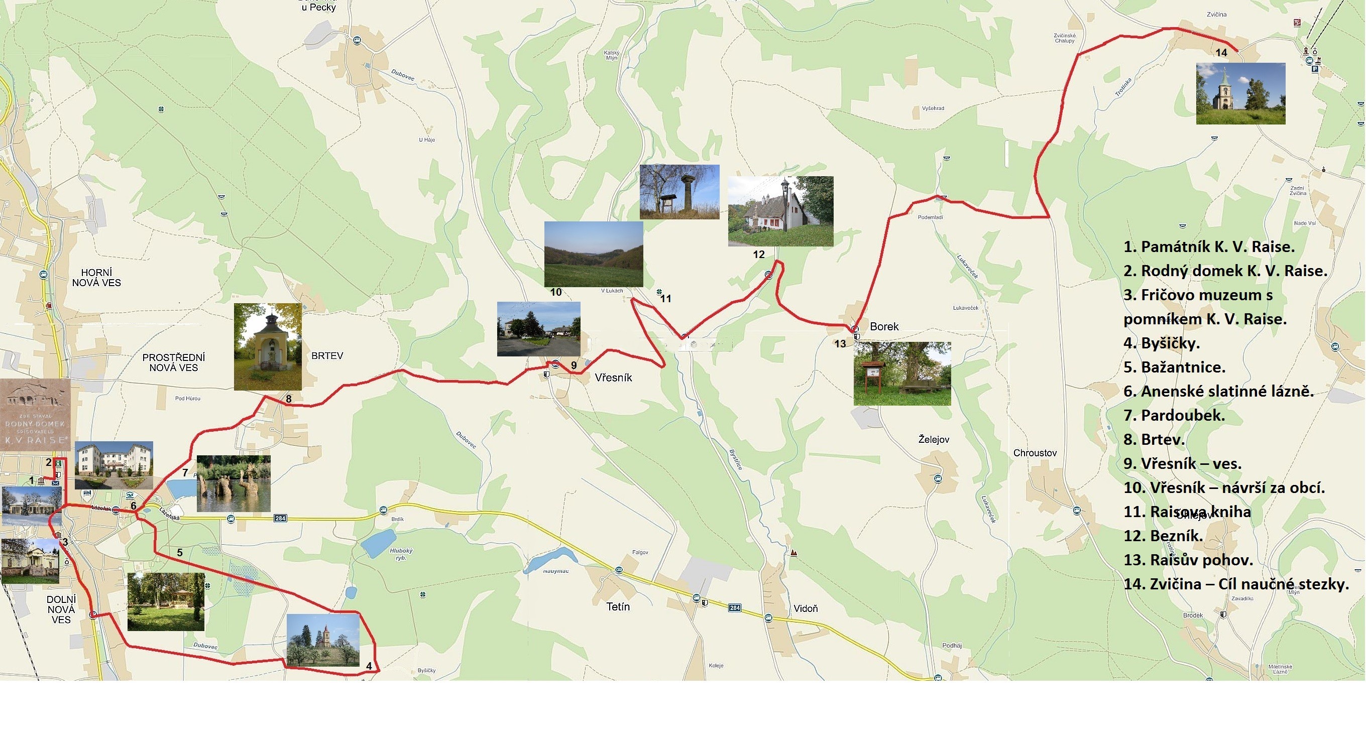 Trasa Lázně Bělohrad – Zvičina začíná v Lázeňské ulici. Po žluté TZ dojdete k Anenským slatinným lázním. Kolem rybníku Pardoubek dojdete do malebné vesničky Brtve. Pak vystoupáte do Vřesníku. Na kopci za Vřesníkem stojí sloup s položenou knihou. Toto místo se jmenuje Raisova kniha. Naučná stezka pak pokračuje do obce Borek s malou zvoničkou. Je tu též zajímavý Raisův pohov. Pak pokračujete přes návrší na Podemladí. Pokračujete dál k osamocenému stavení s krásnou památnou lípou. Po lesní cestě dojdete k silnici. Projdete zvičinou a jste u cíle.