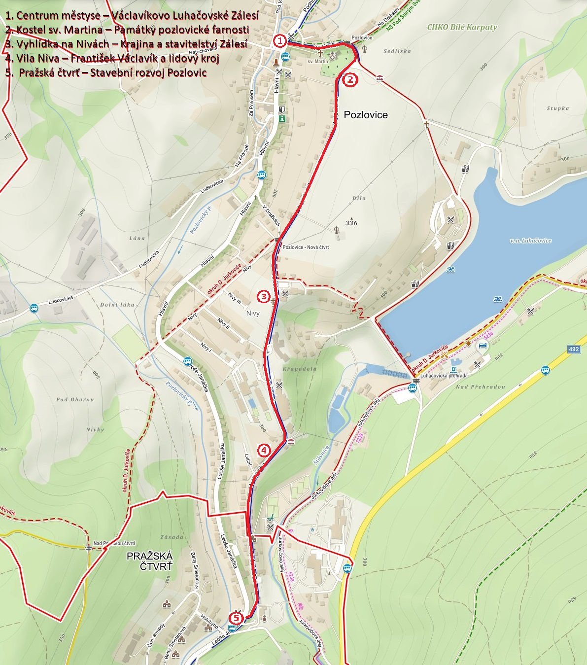 Naučný chodník Antonína Václavíka byl slavnostně otevřen v roce 2009. Začíná v centru Pozlovic, u altánu v jehož těsné blízkosti je první informační tabule a také pamětní deska, která byla odkrytá již v roce 1991 u příležitosti 100. výročí Václavíkova narození. Pět informačních tabulí, které trasu lemují, nás vedou kolem kostela sv. Martina k vyhlídce Na Nivách a odtud k vile Niva, kterou postavil podle vlastního návrhu starší bratr Antonína Václavíka František. Poslední zastavení najdeme v Pražské čtvrti v Luhačovicích. Projekt vznikl za podpory Nadace Děti-kultura-sport a pod výtvarnou realizací jsou podepsání manželé Blanka a František Petrákovi.