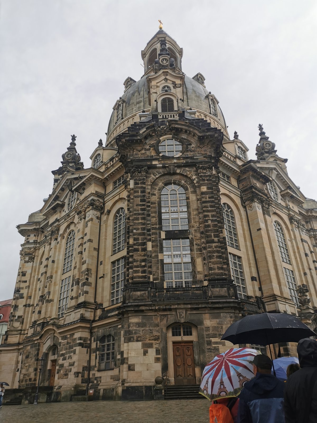 Po unovuzjednotení Nemecka sa situácia zmenila. Tisíce architektov, historikov a inžinierov začali zoraďovať tisíce kameňov, identifikovali ich a označovali pre opätovné použitie pri obnove kostola. Malá časť kostola na námestí pri kostole zostala, je mementom aby sa už nikdy hrôzy vojny neopakovali. Naša nemecká sprievodkyňa nám ukázala fotky kostola po bombardovaní. Dnes je kostol tvorený z cca 43 % z pôvodnych častí, kde každý kúsok bol vrátený na svoje pôvodné miesto. Staršie kusy sú tmavšie, novšie belšie. Materiál, pieskovec, z ktorého je kostol postavený totiž postupne tmavne a po 30 rokoch je takmer čierny. Nie je to preto, že by sčernal od veľkej horúčavy, ktorá pri bombardovaní vznikla, ako sa medzi ľuďmi myľne šírilo.