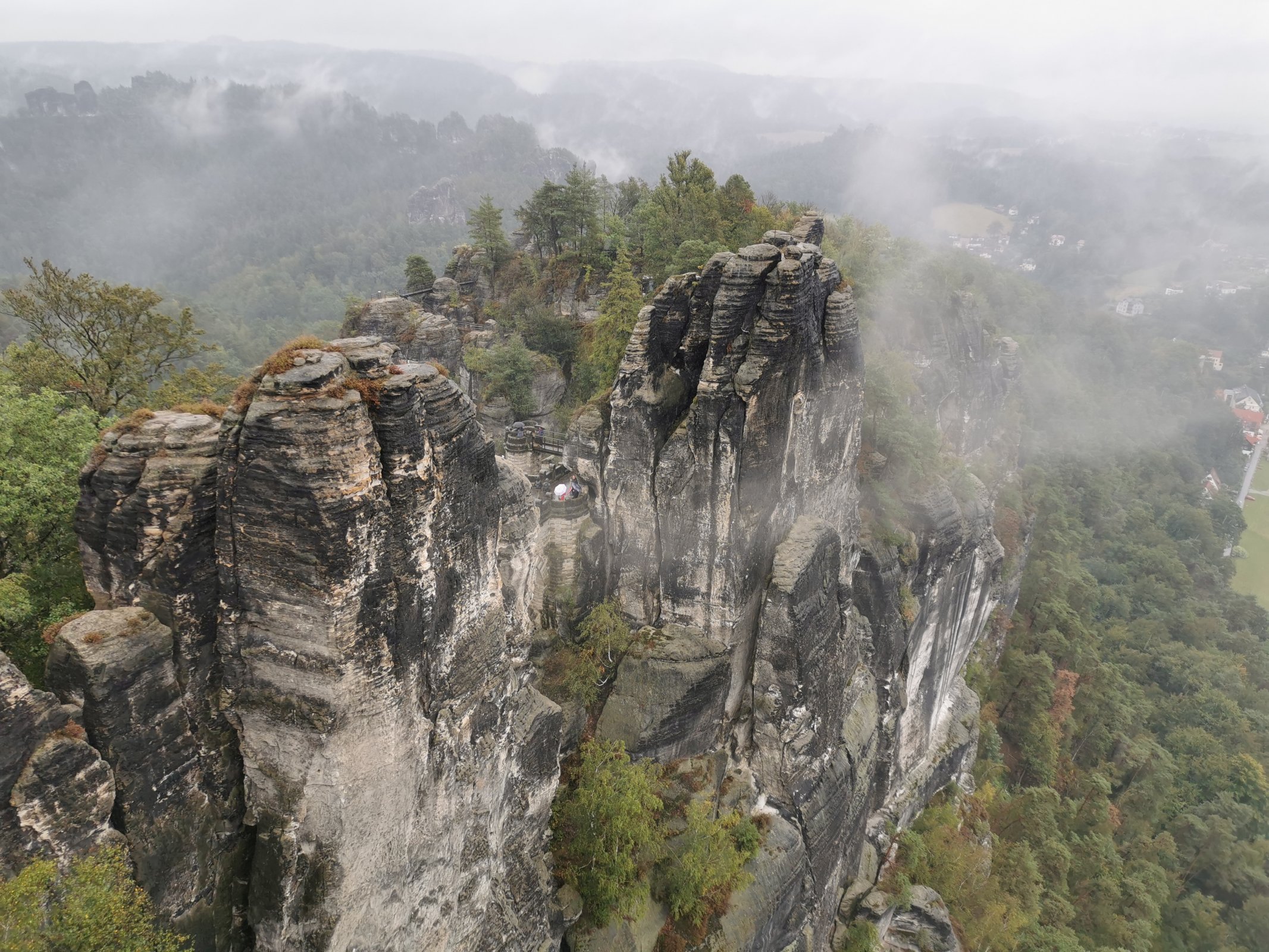 Autobus nás vyviezol na neďaleké parkovisko, odkiaľ sme po cca 400 metrov prišli k hotelu a reštaurácii. Keďže začalo dosť intenzívne pršať, celú 1,5 hod sme strávili v pláštenkách. Dážď nám znepríjemňoval aj fotografovanie. Spravili sme si pár fotiek od vyhliadky u hotela od predajne suvenírov a z vysunutej vyhliadky nad údolím rieky Labe. Nakoniec sme sa ešte prešli po moste a potom už sme sa ponáhlali schovať do zakrytej časti pri hoteli a už sme len čakali na posledných obdivovateľov tohto krásneho miesta aby sme sa spoločne vydali k autobusu.