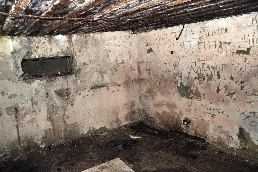 Horní patro bunkru, vstupní chodba, pohled ze strany vstupního poklopu. Vpravo je vidět vchod do hlavní místnosti bunkru.