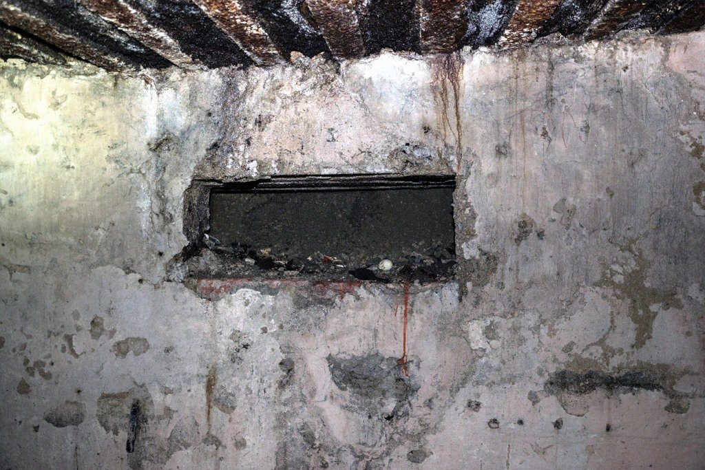 Nejvyšší patro bunkru, hlavní místnost. Otvor a schody do druhého podzemního patra.