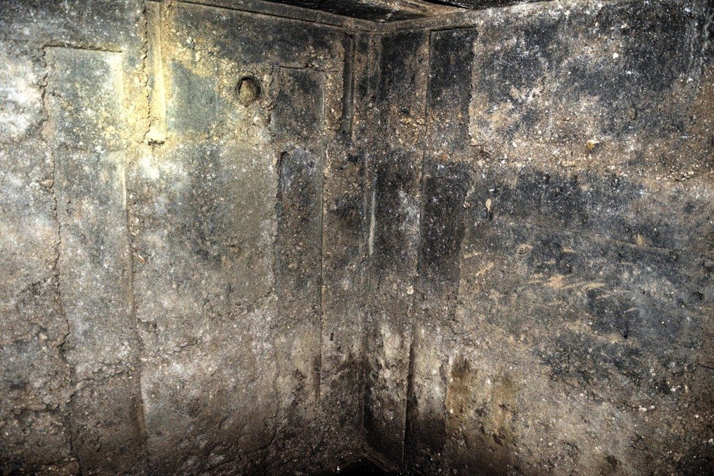 Spodní patro bunkru, otvor a schody vedoucí nahoru.