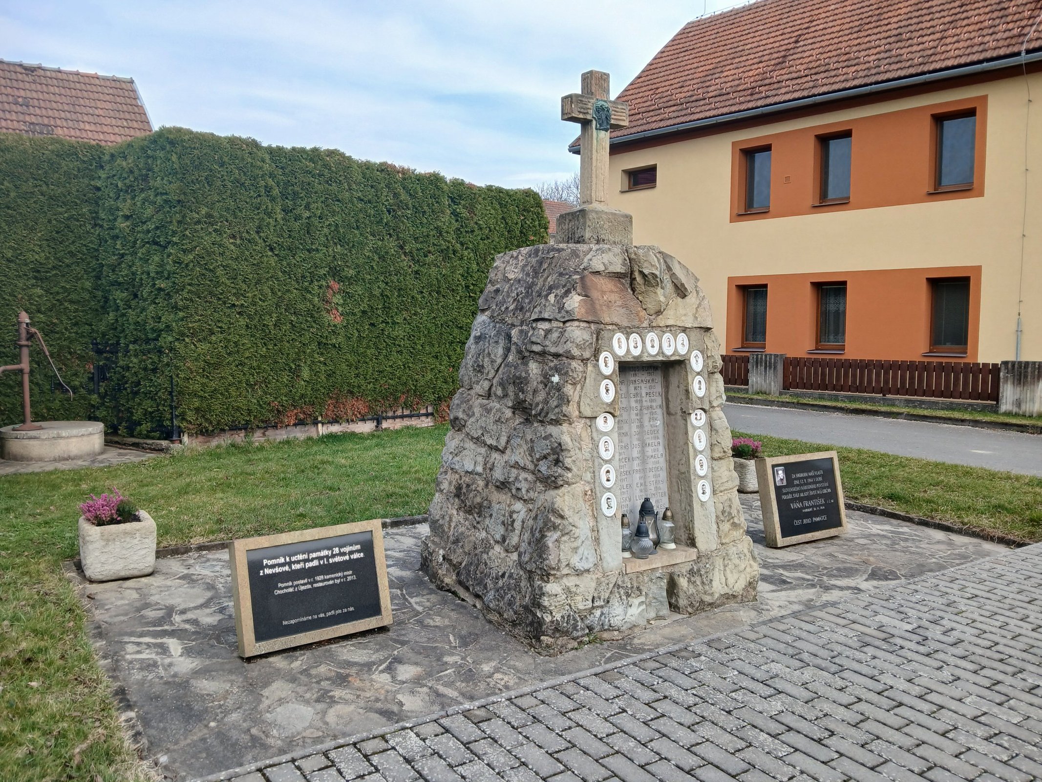 Priestor okolo pomníka je vydlaždený kameňom, pred pomníkom je zámková dlažba. Po stranách hlavného pomníka sú umiestnené ďalšie dve menšie pamätné dosky z čierneho mramoru. Na doske vľavo je nápis "Pomník k uctění památky 28 vojínům z Nevšové, kteří padli v I. světové válce. Pomník postavil v r. 1928 kamenický mistr Chocholáč z Újezda, restaurován byl v r. 2013. Nezapomínáme na vás, padli jste za nás." Na mramorovej doske vpravo je nápis "ZA SVOBODU NAŠÍ VLASTI DNE 12. 9. 1944 V DOBĚ SLOVENSKÉHO NÁRODNÍHO POVSTÁNÍ POLOŽIL SVŮJ MLADÝ ŽIVOT NÁŠ OBČAN VÁŇA FRANTIŠEK z č. 107 narozený 30. 11. 1918. ČEST JEHO PAMÁTCE"