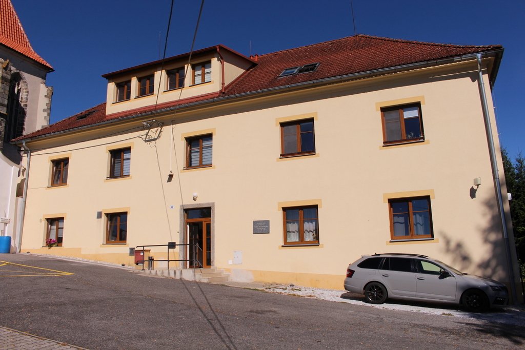 Nezamyslice, budova bývalé školy a místní hospůdka.