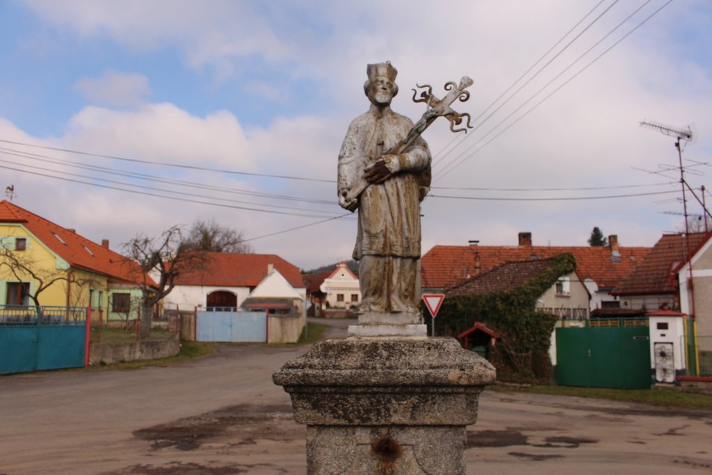 Ves Šumavského podhůří je především známá „Bílým kostelem“, ale najdou se tady i další zajímavé sakrální památky. Jednou z nich je i socha sv. Jana z Nepomuku. Socha stojí uprostřed křižovatky ve východní části obce. Okolo sochy jsou čtyři kamenné sloupky, které v minulosti zřejmě spojoval kovový řetěz. Dnes řetěz chybí a je vidět, že doprava se na sloupcích také podepsala. Samotný podstavec je kamenný a byl na čelní straně opatřen nápisem, který je ale nečitelný. Uvádí se, že socha tady stála již v roce 1726. Původní kamenná socha byla nahrazena o hodně mladší a menší sochou kovovou. Kdy a jak k tomu došlo zůstává pro mě nezodpovězenou otázkou.