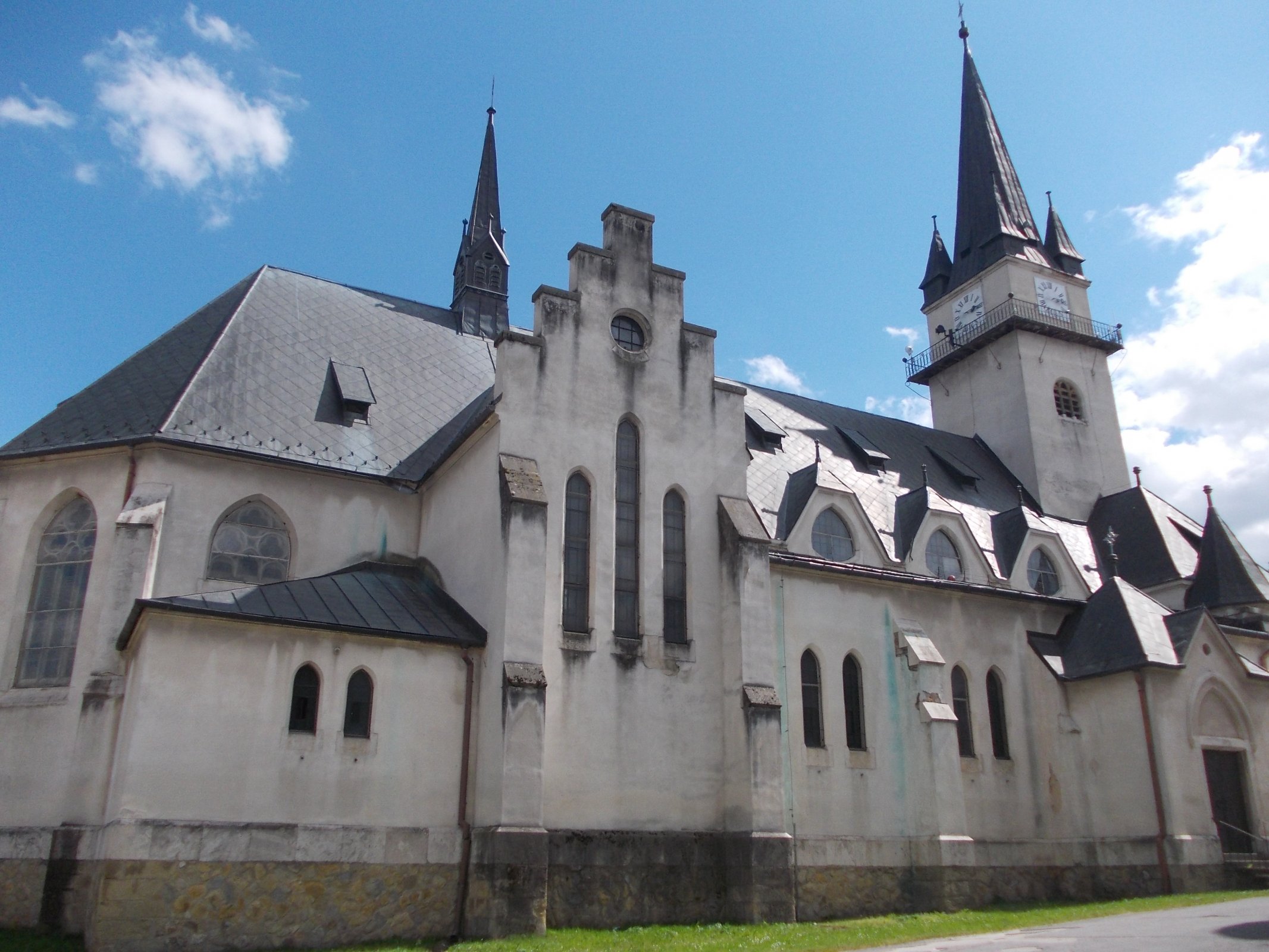 Veža kostola je hranolovitá, vstavaná, má ihlancocitú strechu po stranách so štyrmi malými vežičkami.