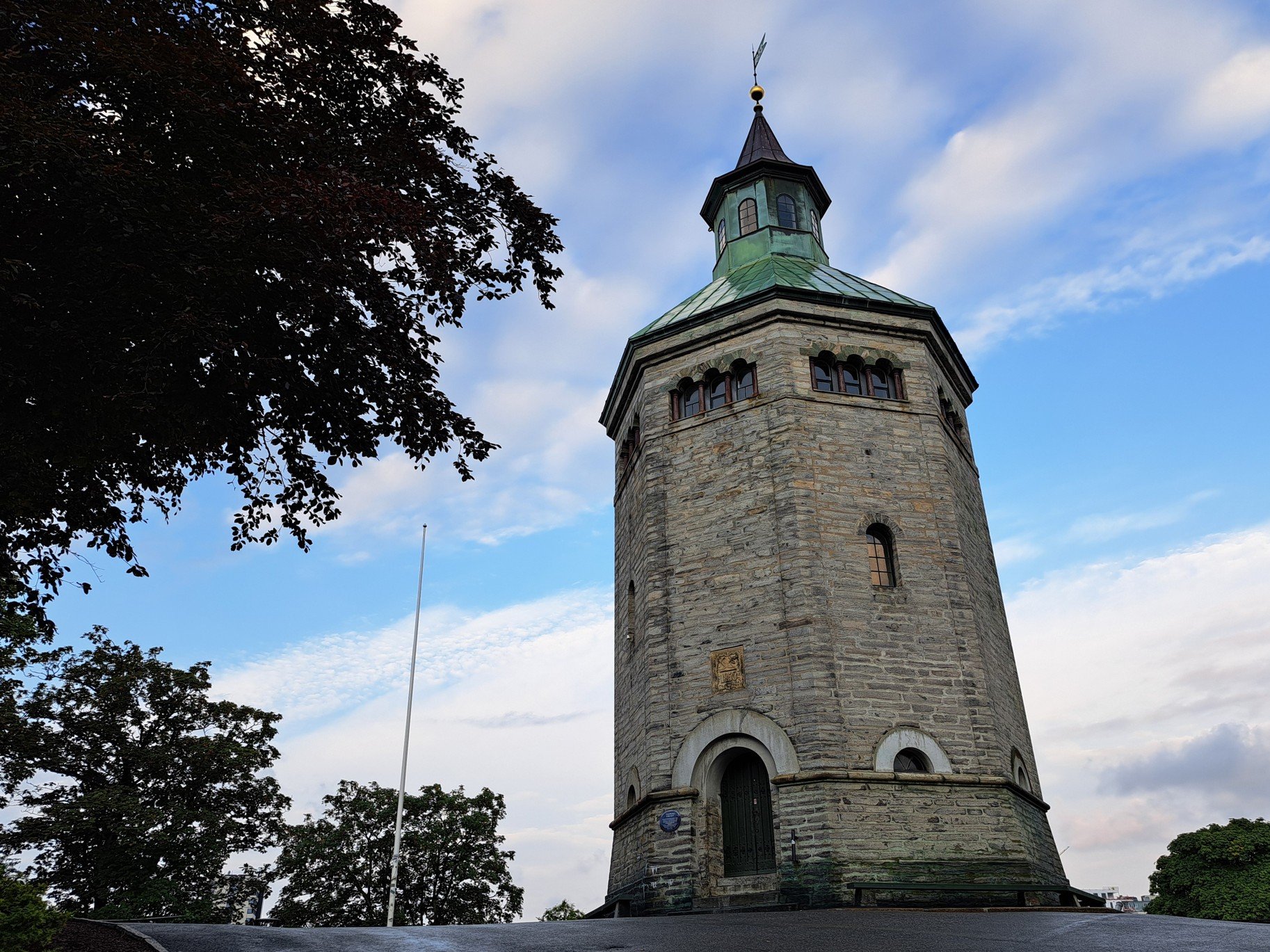 "BYHISTORISK FORENING STAVANGER · VALBERG · TÅRNET · BRANNVAKTTÅRN REIST 1853 · I BRUK AV VEKTERE TIL 1922 · ARKITEKT CHR. H. GROSCH · NYROMANSK STYLE · FREDET · TIDLIGERE STOD HER ET · 8-KANTET TÅRN I TRE · BYGD 1658“
