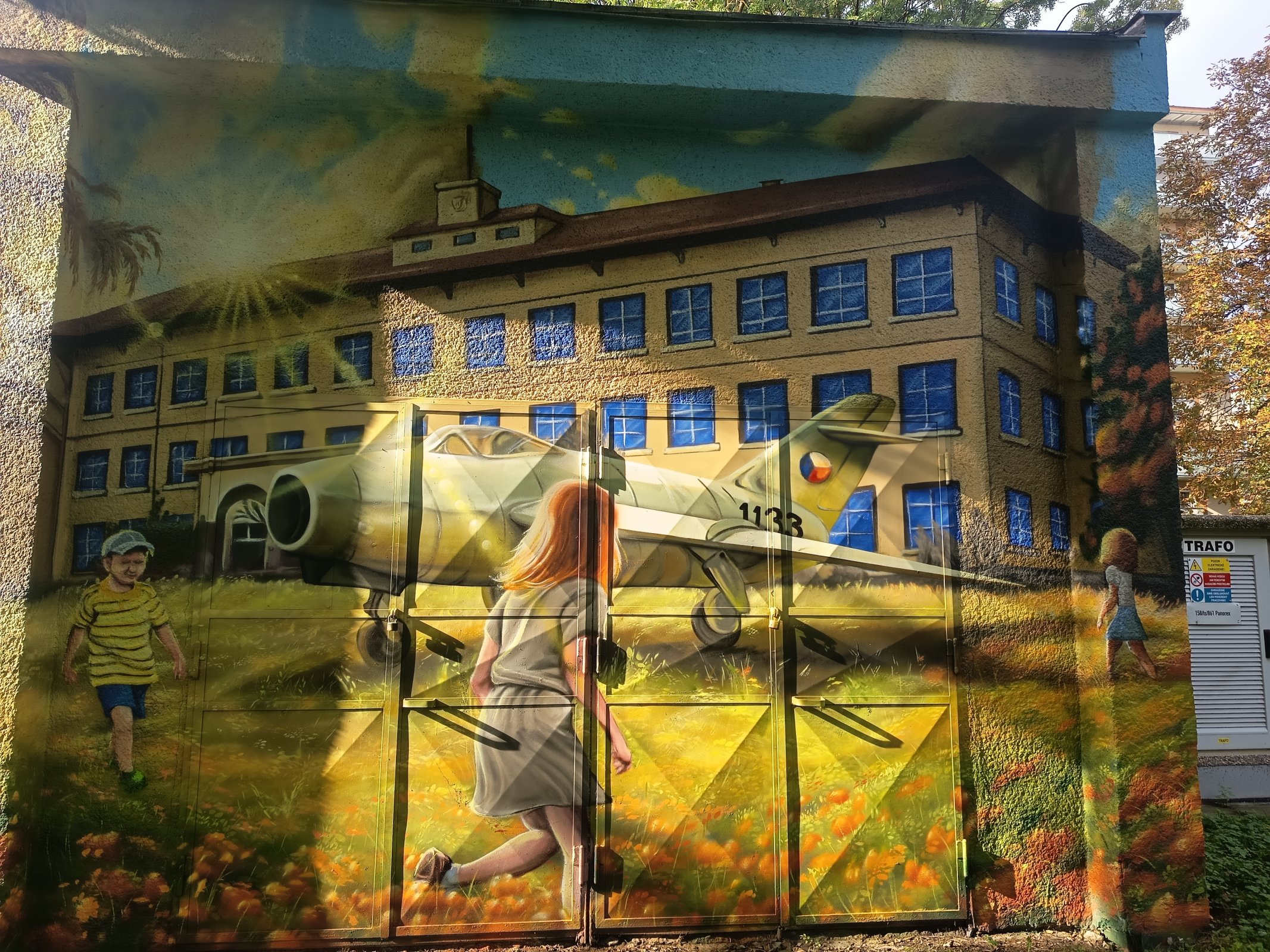 Prvá základná škola s lietadlom je hotová a maliar už maľuje druhú stranu trafostanice