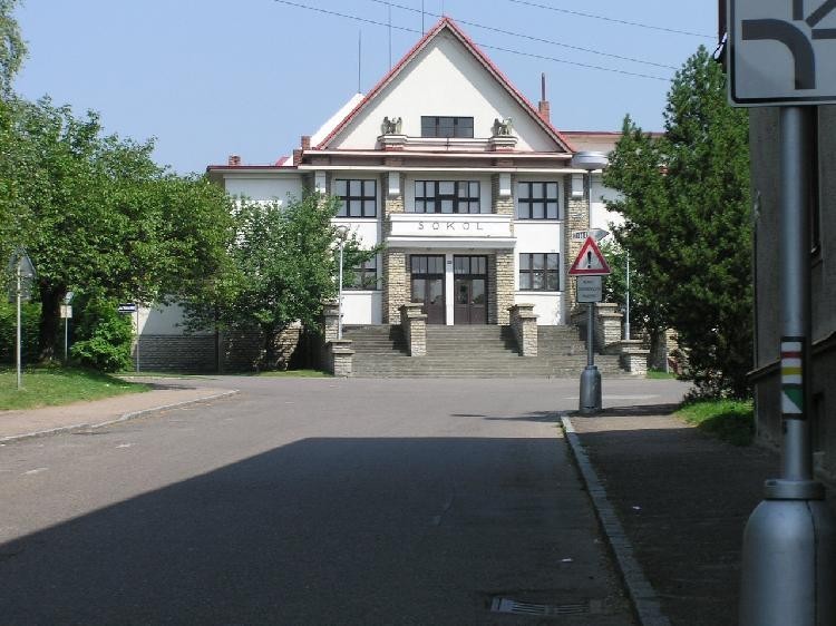 Orientační místo a rozcestí na červené turistické trase ve východní části Nového Města nad Metují u Sokolovny.