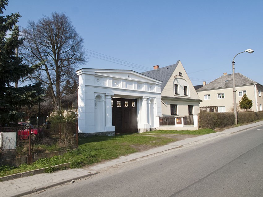Naštěstí sem tam se něco nepodařilo zbourat, někdo snad i usoudil, že je potřeba objekt zachovat. Podobné štěstí měla snad brána u statku, spíše usedlosti čp. 12 v Novém Malíně, dříve Frankštátě. V ulici stoupající ke kostelu vypadá objekt skoro nepatřičně. Jedná se o honosnou bránu do dvora usedlosti. V r. 1863 si ji nechal údajně dle vlastního návrhu postavit majitel Josef Lukas. Suma 410 zlatých, kterou celá věc stála asi nebyla v té době k zahození. Podle vzhledu s rozetami z pálené Hlíny je spíš pravděpodobnější, že autorem i stavitelem je spíše zedník Franz Lukas (proto asi záměna jména) z Dolní Olešné (dnes součást Hrabišína). Brána se žlábkovanými polosloupy, postranními atikami a zmiňovanými rozetami působí vskutku jako vjezd do nějakého panského sídla. Sousedící budova usedlosti je daleko skromnější a bohužel již opatřena novější omítkou, naštěstí poměrně decentní.