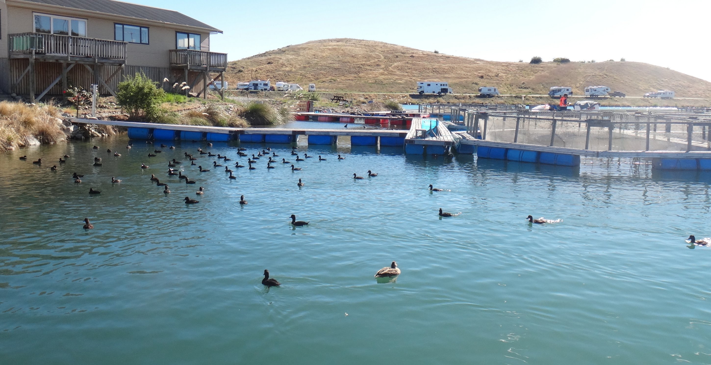 Z Oamaru cestou k Pukaki Lake jsme se zastavili nedaleko Twizelu na rybí farmě. U vchodu nás přivítaly obrázky "rybích víl", které vypadali jako ženich a nevěsta. Po vstupu do obchodu a zároveň restaurace jsme byli vybídnuti k ochutnávce lososů. Malinké kousíčky byly upraveny asi čtyřmi způsoby. V mrazicích boxech byli lososi k prodeji. My jsme tam byli asi kolem desáté hodiny, tak restaurace ještě nic dalšího k snědku nanabízela. Šli jsme se tedy podívat ven k sádkám, kde se proháněli nejen lososi, ale také kachny.