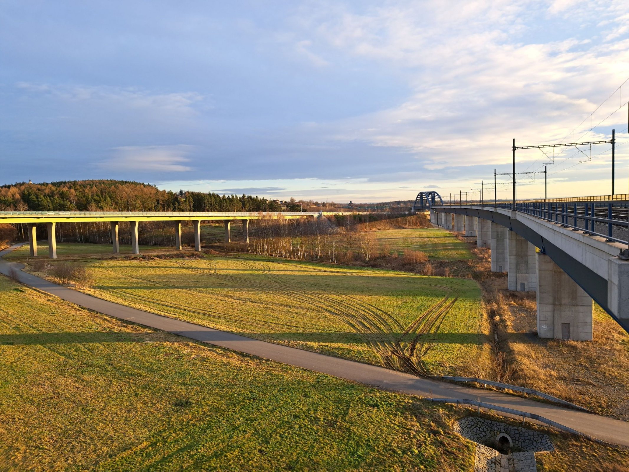 S výstavbou dálnice D3 vyvstala potřeba nové přeložky trati křížící zmíněnou silniční stavbu. Byl navržen obloukový most o délce 125 metrů, na který navazuje mostní estakáda překonávající údolí u vesnic Rzavá a Moraveč.