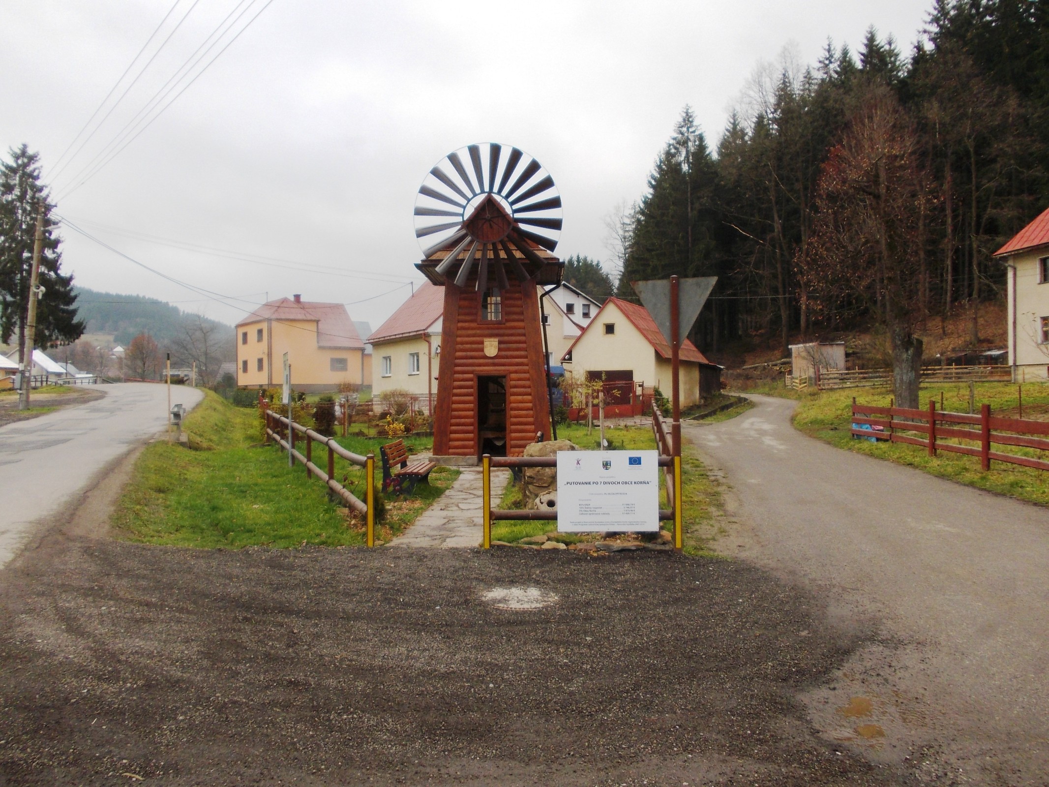Dnes by som vás zoznámil s jedným zo siedmych divov Korne, ktoré vznikli hlavne za prispenia financovania Europskou úniou a Europského fondu regionalného rozvoja. Po svojich potulkách Nemeckom, Holandskom i Škandináviou som bral v týchto štátoch Veterné mlyny ako samozrejmosťou, ale že bol i na kysuciach ma troška prekvapilo. V obci sa v minulosti nachádzal veterný mlyn v ťažko dostupnej časti v osade u Šulcov. Zariadenie tohto mlyna do obce doviezol predok občana obce Jozefa Gajdičiara, ktorý pracoval ako baník v Ostrave na severnej Morave. Veterná turbína sa otáčala podľa smeru vetra, ktorý roztáčal lopatky vrtule. Mletie prebiehalo najlepšie, keď fúkal severný vietor. Mlyn mlel obilie hlavne pre dobytok až do roku 1985. Jeho následovník bol dokončený v auguste roku 2013 v aktivite "Sedem divov obce Korňa", a je takou novou symbolikou a jednou z dominant obce. Nachádza sa pri hlavnej ceste v časti Nižná Korňa. Táto replika je fukčná a podobný mlyn sa nachádza i v skanzene vo Svidníku, kde tento mlyn presťahovali zo susedného Poľska. Pred mlynom je i náhrobný kameň dvoch nemeckýh vojakov, ktorí tu padli počas 2. svetovej vojny. Aj toto si treba pripomenuť, veď obyčajní vojaci za to všetko nemohli. Pri mlyne je i informačná tabuľa so zaujimasťami v okolí, krčma a obchod, kde si môžete zakúpiť i pohťadnicu tohto mlyna. Pokusím sa v budúcnosti navštíviť ďalšie z divov tejto obce a zoznámiť vás s nimi.