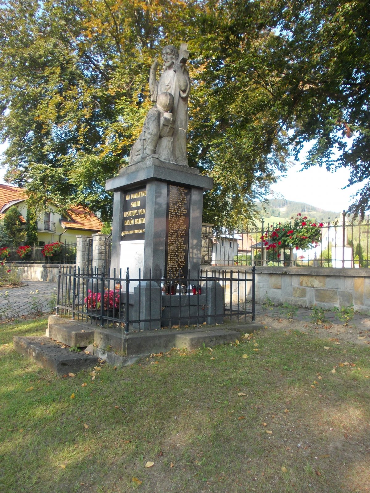 Pamätník padlých v prvej svetovej vojne je súsoším umiestneným na podstavci. Pamätnk postavili v roku 1930. Zhotovila ho firma R. Rimpler z Piešťan. Súsošie znázornuje stojaceho Krista v ľavej ruke s krížom a pred ním na kolenách klačí zranený voják. Slávnostný akt vysvätenia tohto pamätníka sa konal 14. septembra 1930. Súsošie z pieskovca je umiestnené na žulovom podstavci, na čiernych mramoroných doskách sú vytesané mená viac ako sto vojakov, obetí svetovej vojny, v čelnej časti je nápis :