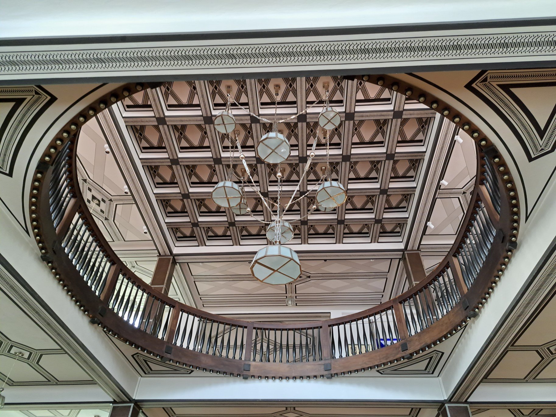 Krásný velký lustr v průhledu do prvního patra původní asi není, ale s originální stropní výmalbou vypadá úžasně.